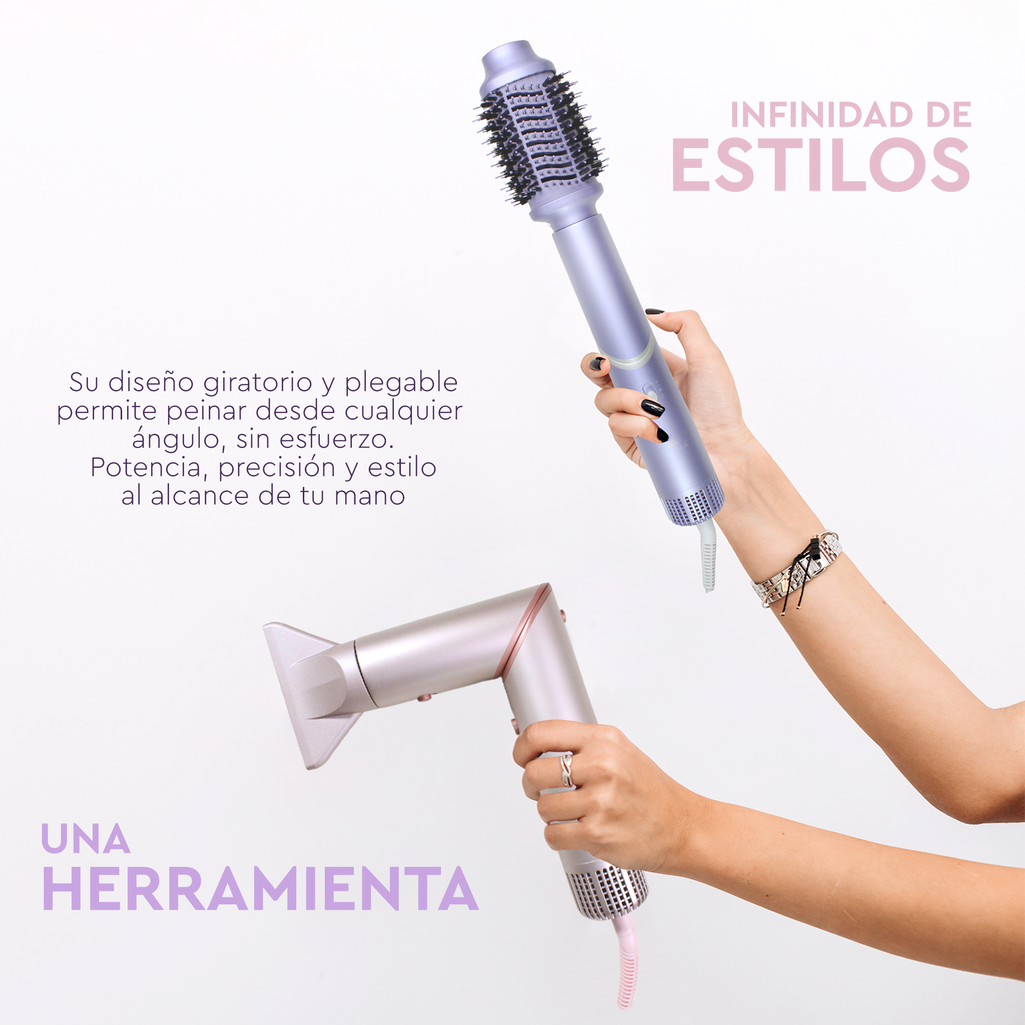 El brazo plegable y giratorio rápido le permite usar la herramienta tanto en forma recta como doblada para garantizar un secado y peinado sin esfuerzo desde cualquier ángulo.