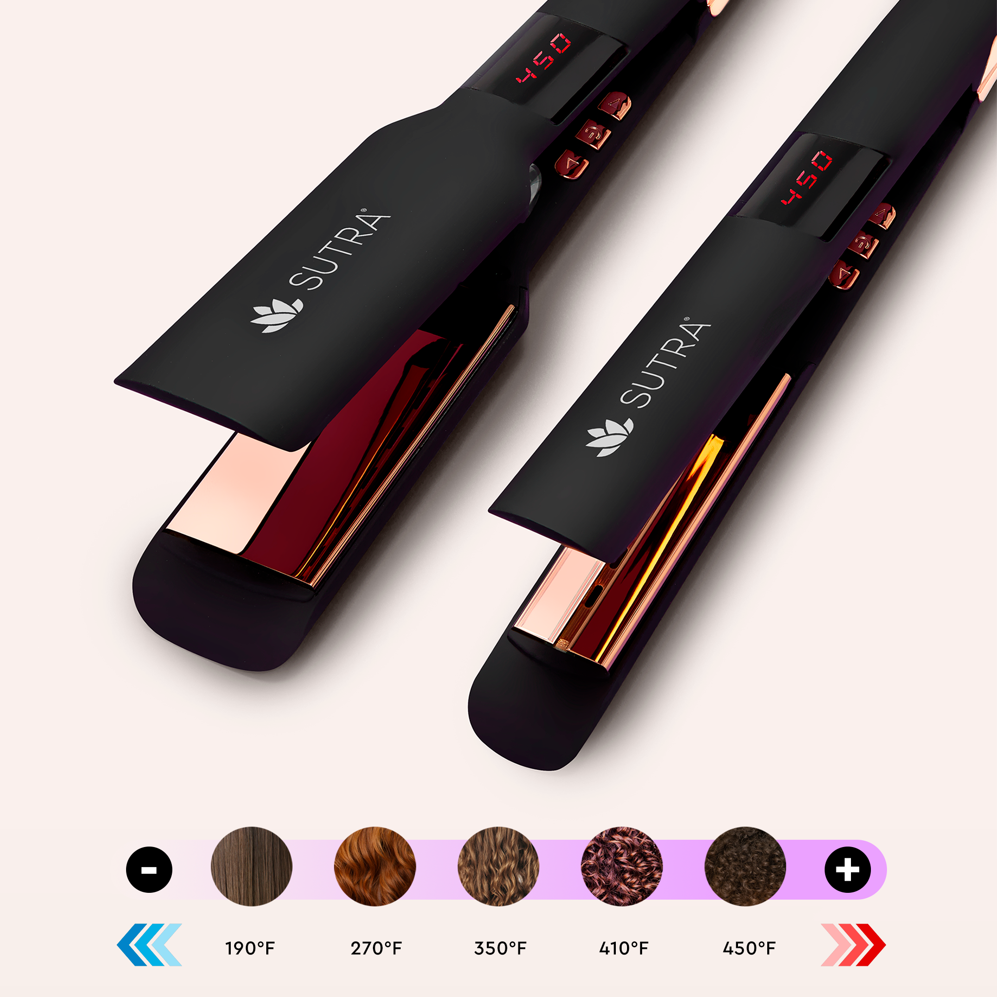Peinado más rápido con calor más suave. Con nuestras exclusivas tecnologías Healthy Heat ™ de infrarrojos lejanos (IR) e iónica. Proporciona una distribución uniforme del calor, lo que permite usar ajustes de temperatura más bajos. Las placas de titanio de deslizamiento suave brindan un brillo excepcional. La tecnología IR penetrante sella las cutículas del cabello para resultados más duraderos, un cabello más suave y saludable.